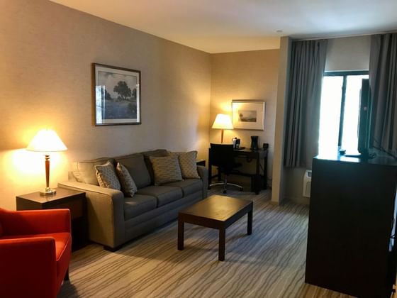 Our Junior Suite is a great upgrade for the special guests in your group or anyone who needs extra space. These rooms feature a small living room with a pullout couch, a king bed, full bathroom, and plenty of space to store your luggage.