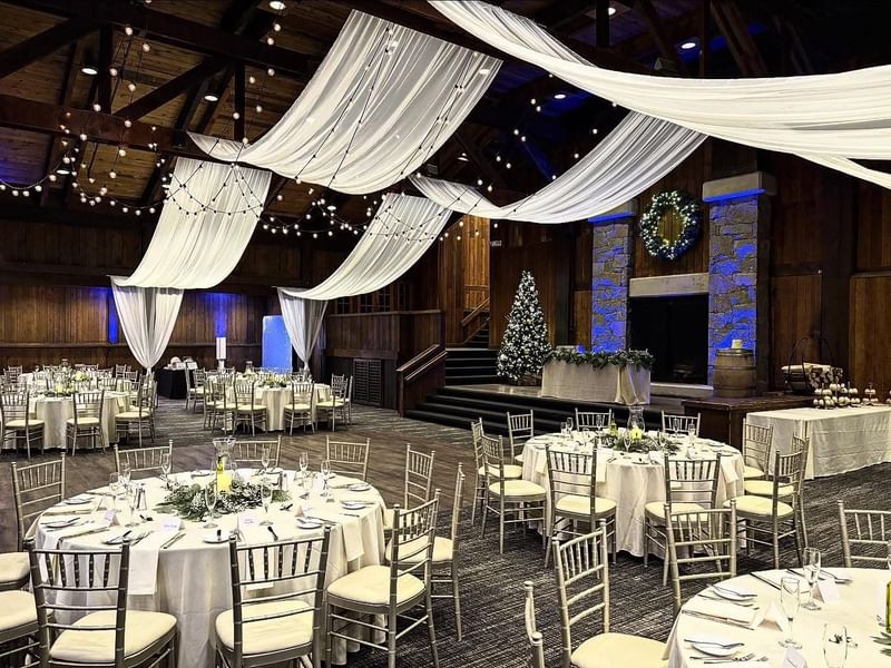 - Venues options include the Garden Room, Outdoor Stone Garden, Terrace Room and Patio, Timbers Ballroom, and The Vineyard
